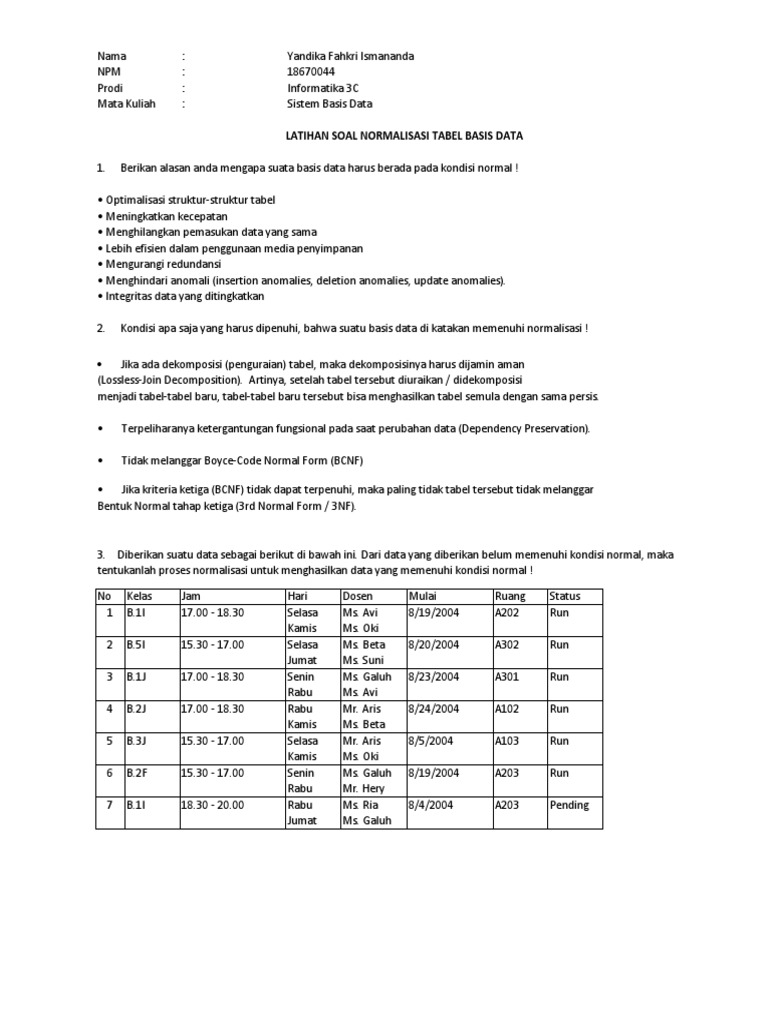 Normalisasi Database Heru Lestiawan M Kom Pdf Free Download from docplayer.info Setelah kemarin kita telah membedah kasus normalisasi tentang tabel rapat_karyawan sekarang untuk menambah pemahaman lagi kita akan membedah kasus normalisasi lainnya. Simpan simpan soal dan jawab normalisasi untuk nanti. Contoh soal dan jawaban laporan arus kas metode langsung dan tidak langsung. Inilah pembahasan lengkap terkait contoh soal normalisasi basis data dan jawabannya pdf. Contoh soal normalisasi basis data dan jawabannya pdf. Download contoh soal normalisasi basis data dan jawabannya pdf lengkap.tahun konsumsi beras perkapita (cons) gdp nominal per kapita (x). Normalisasi database form rudiawan16 1. Pada teori ilmu ekonomi makro disebutkan bahwa c = f(y), yaitu cons = b0 + b1x dimana pendapatan nasional berbanding lurus dengan konsumsi masyarakat.